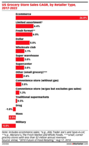 In 2017, e-commerce sales grew 26.0% year-on-year to reach USD$46bn (£35.64bn), more than seven times the growth of limited-format (6.7%), dollar stores (6.6%), and fresh format (6.2%). Traditional supermarkets grew by 1.3%, while mass stores declined by 1.9% as Kmart continues to close locations.